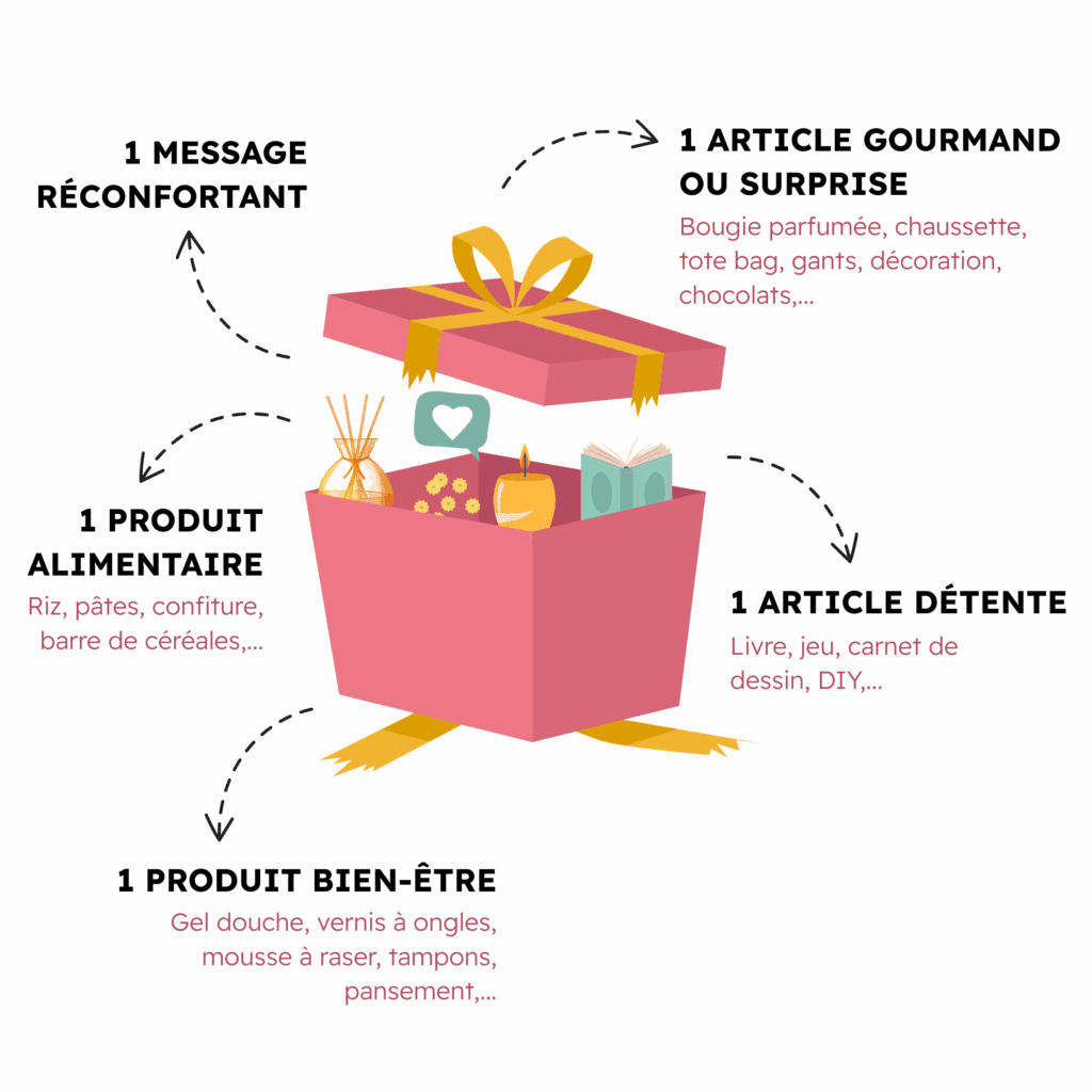 Le concept est simple : vous préparez une petite boîte remplie de surprises. Elle sera ensuite remises aux étudiant·es de Morlaix, en priorité aux étudiant·es boursier·es, afin de leur offrir un moment de joie et de réconfort pendant les fêtes.